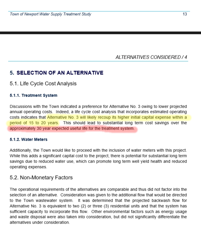 The included document projects the loan for this project will not be paid for 15 – 20 years. Do not look for a water bill reduction any time soon. To make matters worse the life expectancy of the treatment plant is only 30 year! So I guess your children’s children will possible get a water bill reduction for a short period and then they will have start all over. Wayne Elliot A&E will be right there to help us get further in debt once again.