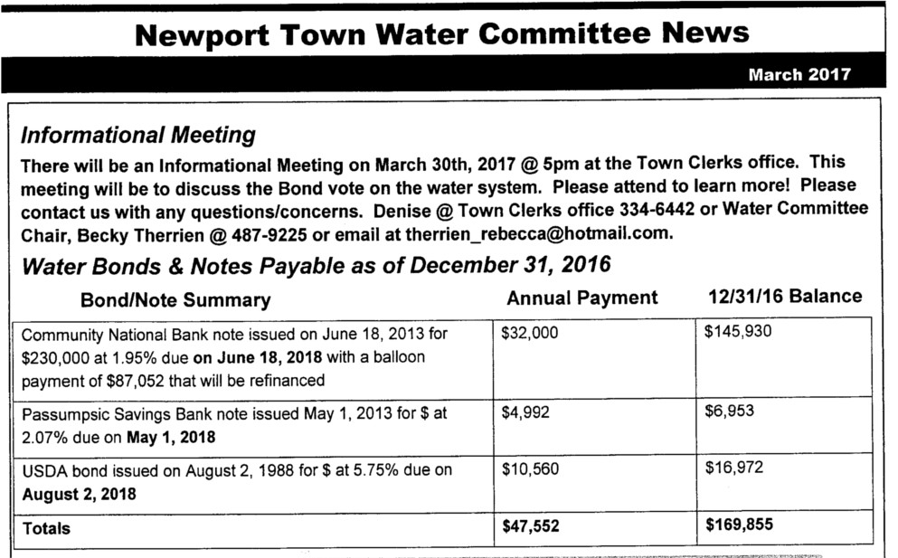 I received a news l receive a news letter form the water committee. It was created by Becky Therrien. On the letter it suggested that she address any questions and to direct this to her email. In past dealing with the water committee there has been great reluctance in getting any answers from the committee members. Here are some of the questions I have and the the letter if you have not seen this.