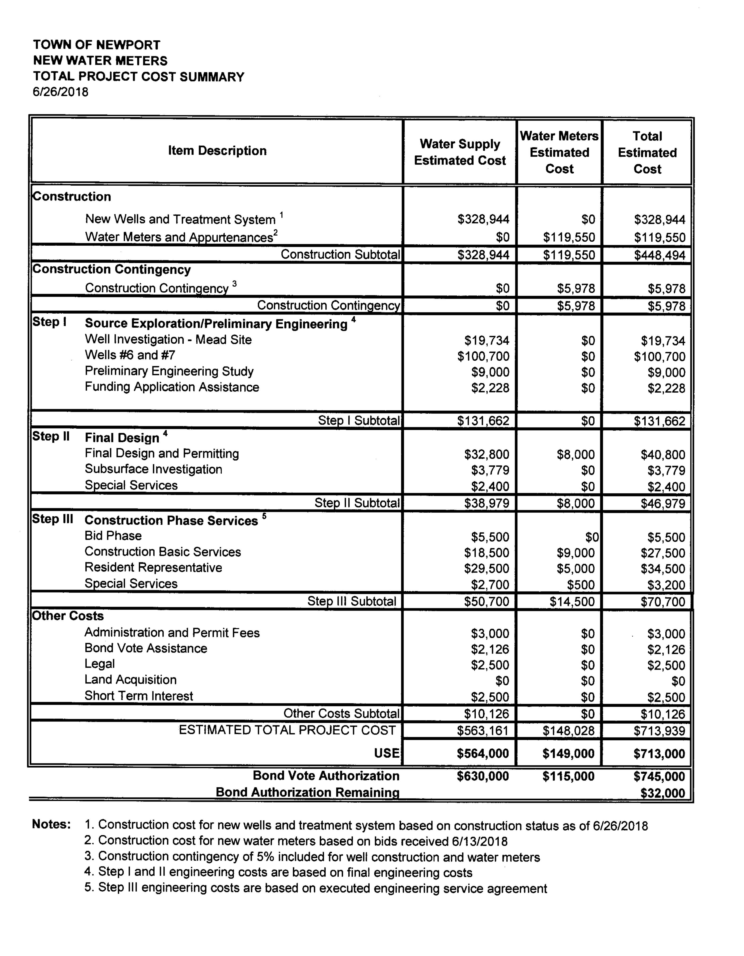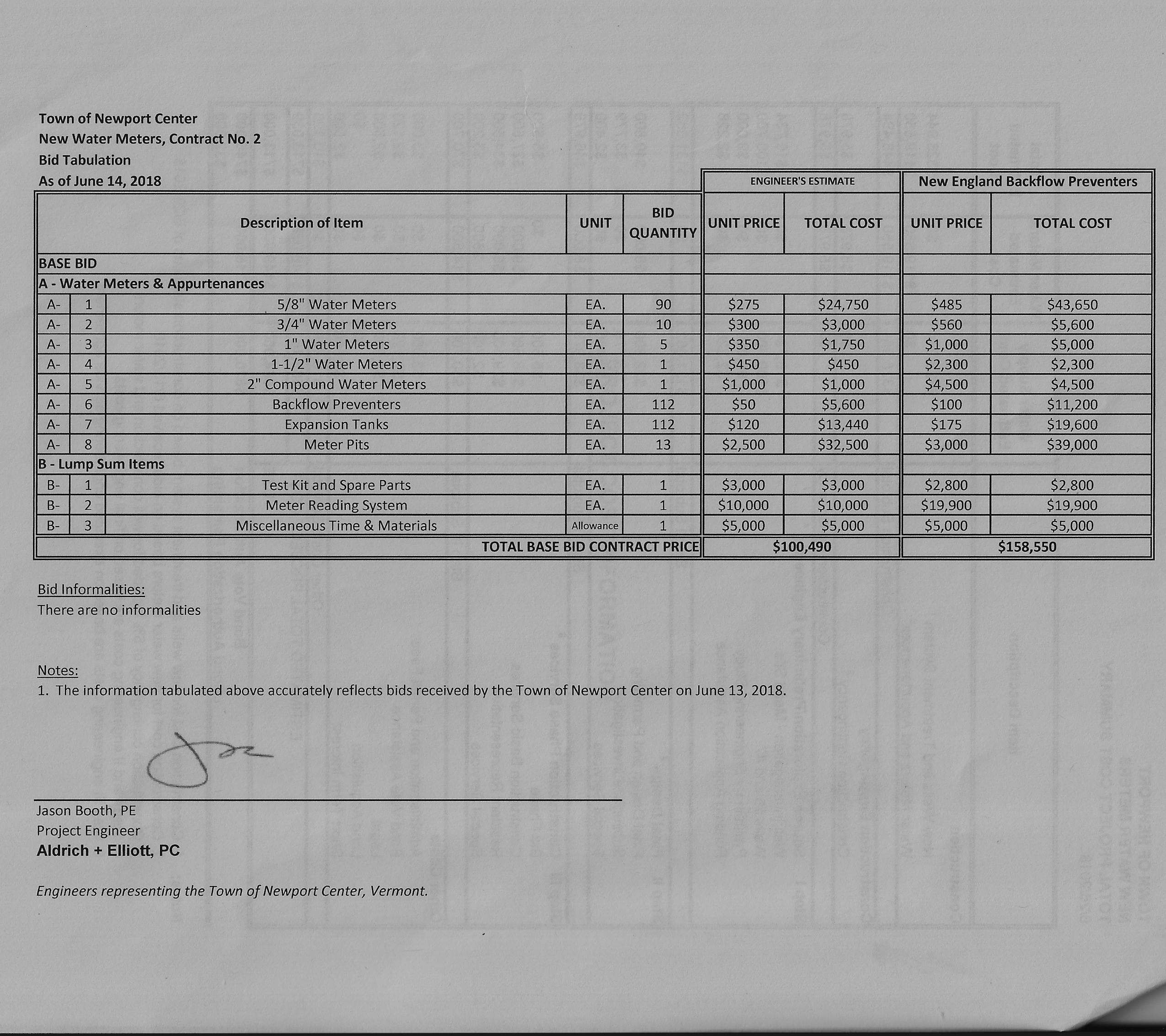 Here are the details of the water meter installation. This figure was quoted as 158,000 which would have exceeded the available funds. At the meeting the bid was modified by omitting an item reducing the cost to 119,000 which would stay inside the available funds with out going in the red.